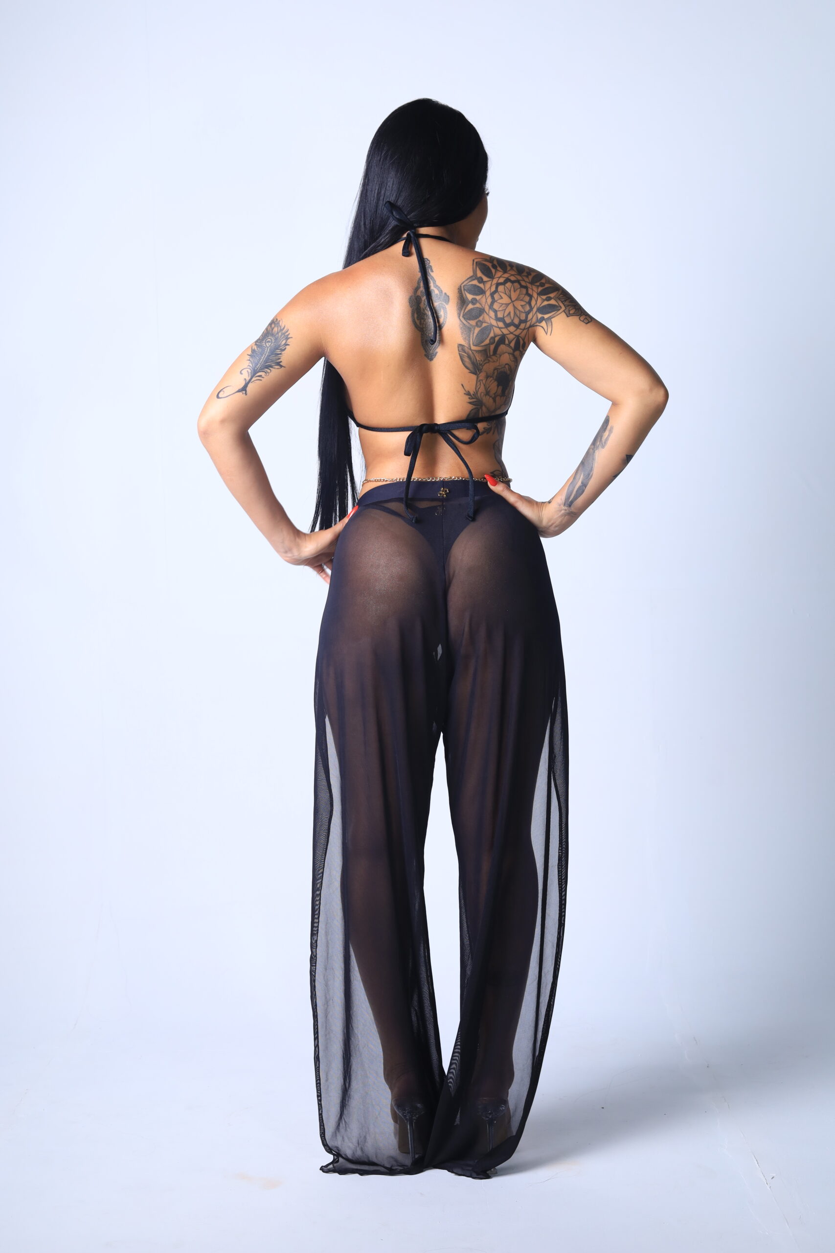 Calça de tule transparente com caimento leve e fluido, ideal para compor looks de praia ou pós-praia com sensualidade e elegância. Com modelagem aberta nas laterais, valoriza a silhueta e proporciona um visual ousado e moderno. Perfeita para sobrepor biquínis ou bodys, é a peça-chave para quem quer estilo e atitude à beira-mar.